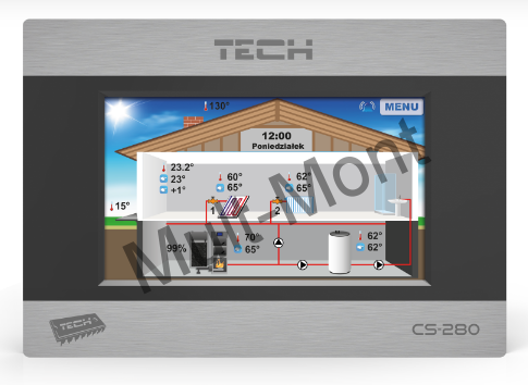 Použitie izbového regulátora poskytuje pohodlné ovládanie a kontrolu izbovej teploty, kotla, bojlera a zmiešavacích ventilov priamo z miestnosti, bez nutnosti chodenia do kotolne. Izbový regulátor pracuje iba v spolupráci s hlavným regulátorom vybaveným RS komunikáciou firmy TECH. Veľký, čitateľný, farebný, dotykový displej dovoľuje pohodlnú obsluhu regulátora a moduláciu jeho parametrov. Jednoduchá inštalácia na stenu, estetika zariadenia, čelný dotykový panel a taktiež jeho rozumná cena sú ďalšími výhodami regulátora.
